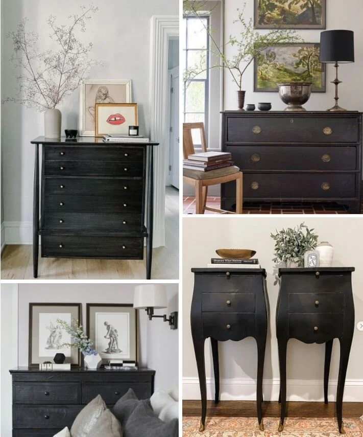 Typically I'm team never ever paint wood - but for a while now, I've wanted to find a vintage or thrifted dresser (that needed a little TLC) and paint it black. Below are some of the images that I've saved to my Pinterest board, and for months now I've be looking for a dresser to refurbish, but really haven't found what I was looking for. The must-haves for the piece were 1) it had to have good bones (dove-tailing would be a bonus) and made well, 2) it had to have some detail to it (wheels on the legs would be a bonus - I love me some wheels on big furniture), 3) the hardware would be original and in good shape, and finally 4) it had to look like it needed a lot of TLC (so that I felt ok about painting it). But up until Tuesday evening, I've come up short as it seemed one (or more) of my must have list items were always missing.