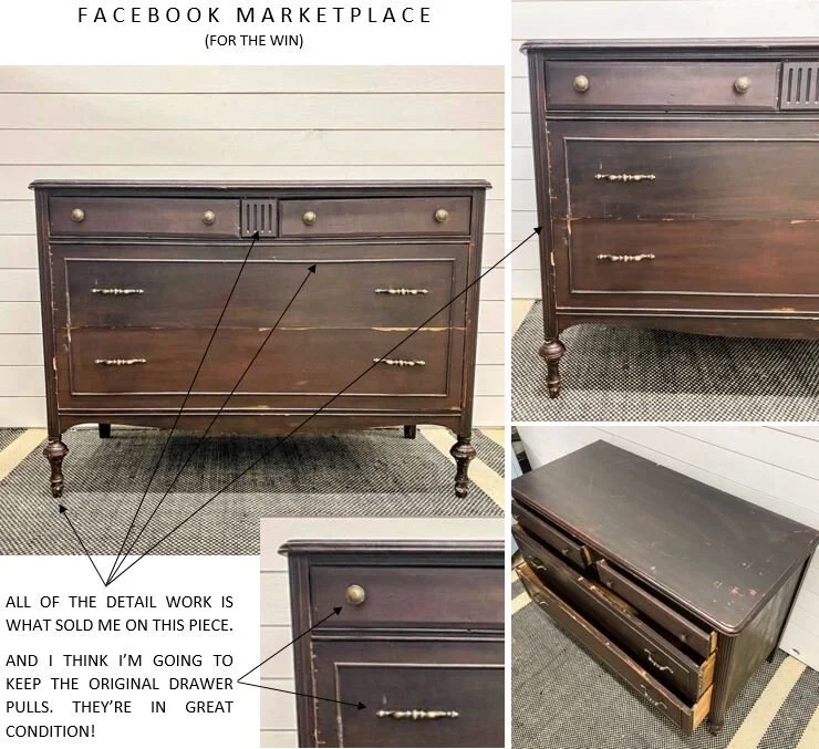 It checked off all the boxes! It was well-made, dove-tailed drawers, original hardware, lots of detail, and it needed some love. Check - check - check - and check! But (because I'm me) I didn't pull the trigger...yet. Later that evening my friend Cameron posted a question on IG, asking his followers what they were looking for and what area did they live in. From there, he was going to go on Facebook Marketplace to see if he could find those items (or something similiar). I wrote that I was looking for a vintage dresser to paint black, and a few hours later he gave me 3 options - one being the exact dresser I was already looking at, the one below.